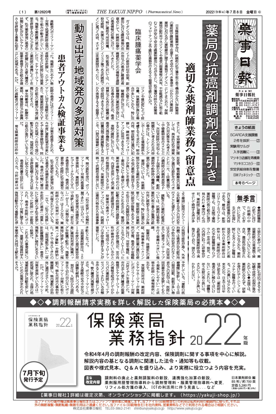 2022年7月8日 20時57分 『かかりつけ薬剤師・薬局におけるがん薬物療法に関するガイダンス』 薬事日報に、日本臨床腫瘍薬学会が取りまとめた『かかりつけ薬剤師・薬局におけるがん薬物療法に関するガイダンス』の記事が掲載されました。(2022年7月8日付)